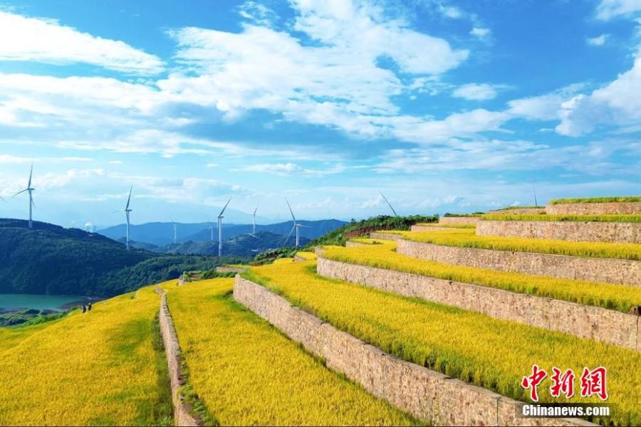 An abandoned quarry turned rice field enters harvest season with wind turbines at the background, forming a unique landscape in Hezhou, south China's Guangxi Zhuang Autonomous Region. (Photo: China News Service/Deng Jingzi)