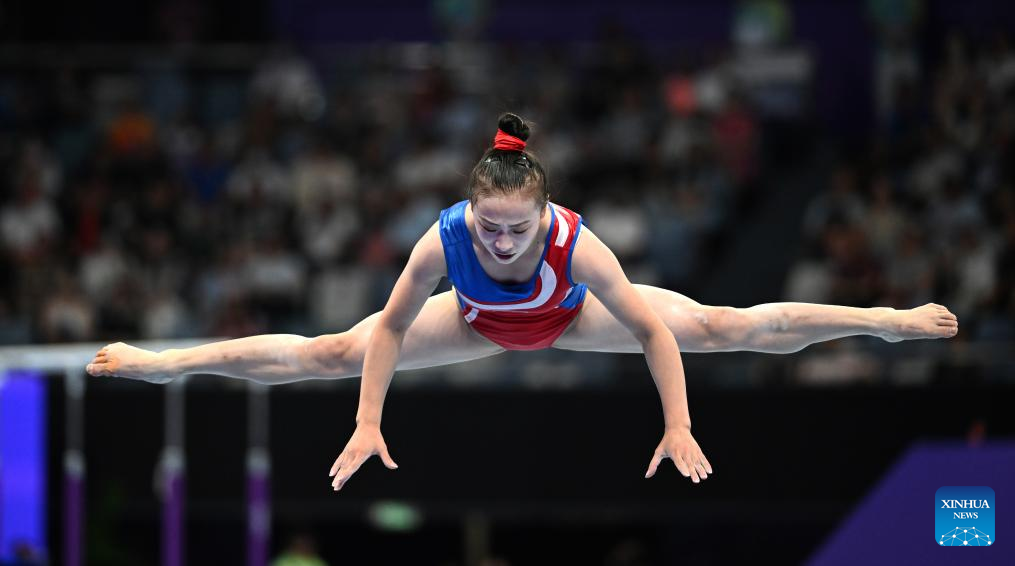 Sim Haewon of the Democratic People's Republic of Korea (DPRK) competes on the floor of Women's Qualification and Team Final of artistic gymnastics at the 19th Asian Games in Hangzhou, east China's Zhejiang Province, Sept. 25, 2023. (Xinhua/Cheng Min)