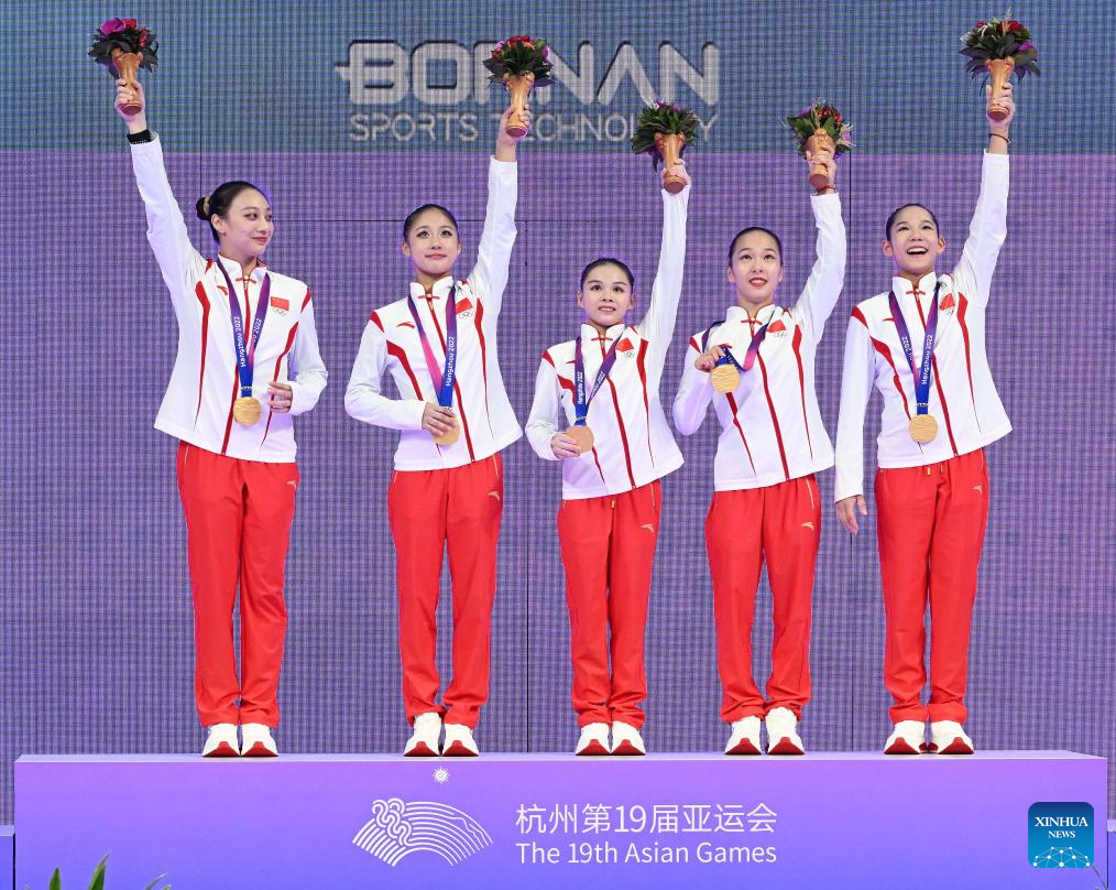 Gold Medalists of Team China attend the awarding ceremony after Women's Qualification and Team Final of artistic gymnastics at the 19th Asian Games in Hangzhou, east China's Zhejiang Province, Sept. 25, 2023. (Xinhua/Cheng Min)