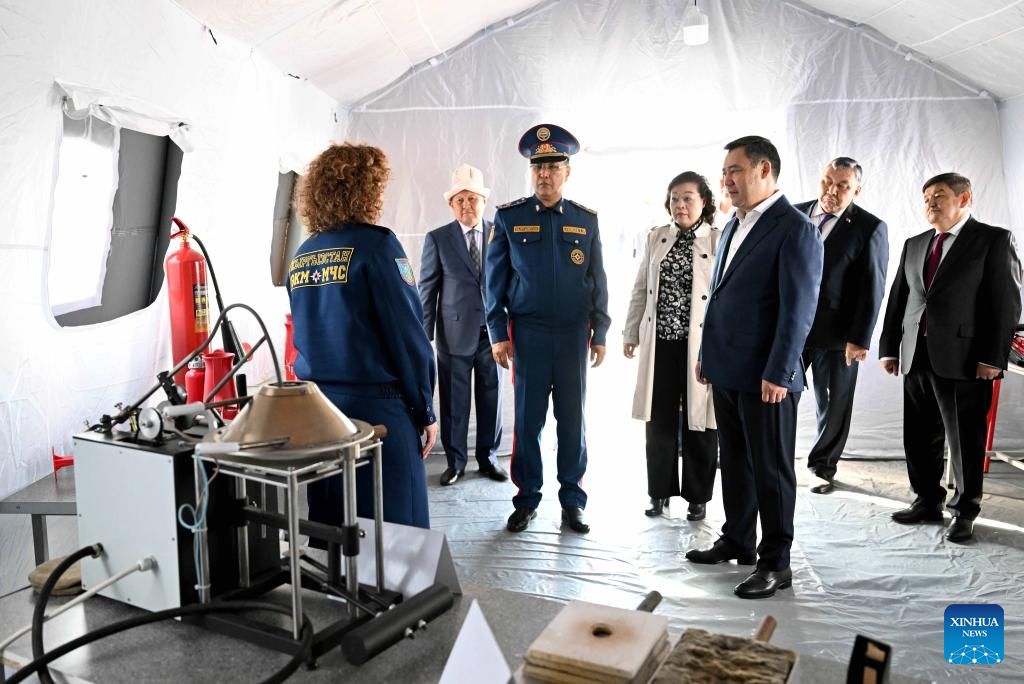 Kyrgyz President Sadyr Japarov (3rd R) inspects the equipment of mobile hospitals accompanied by Chinese Ambassador to Kyrgyzstan Du Dewen (4th R) in Bishkek, Kyrgyzstan, Sept. 24, 2023. A handover ceremony of two sets of mobile hospitals from China to the Ministry of Emergency Situations of Kyrgyzstan was held here on Sunday. Kyrgyz President Sadyr Japarov and Chinese Ambassador Du Dewen attended the event. (Photo by Roman/Xinhua)