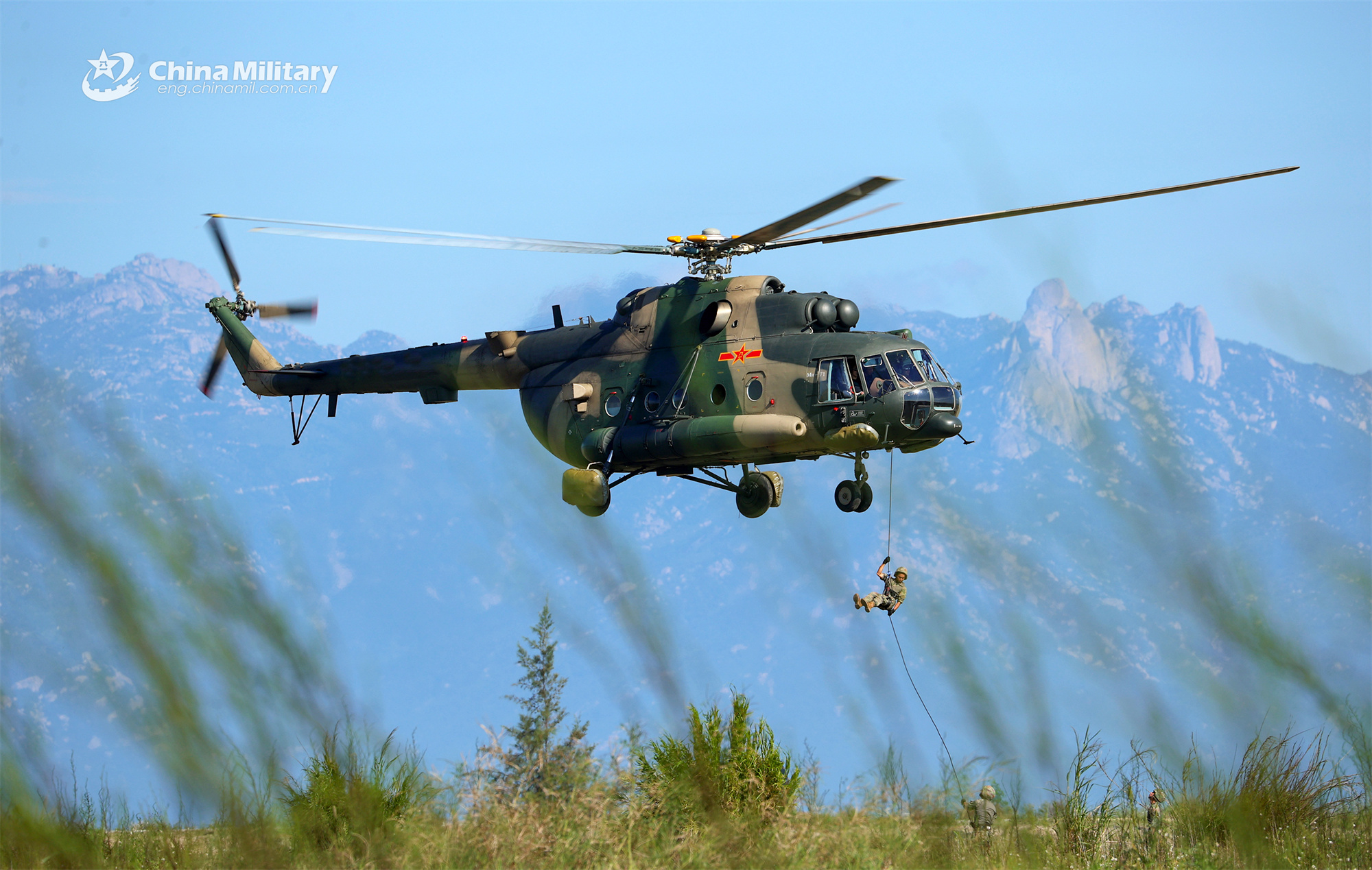 A soldier assigned to a combined-arms brigade fast ropes down from a Mi-171 transport helicopter attached to an army aviation brigade of the PLA 72nd Group Army during a coordination training exercise on September 11, 2023. (eng.chinamil.com.cn/Photo by Zhang Huanpeng)