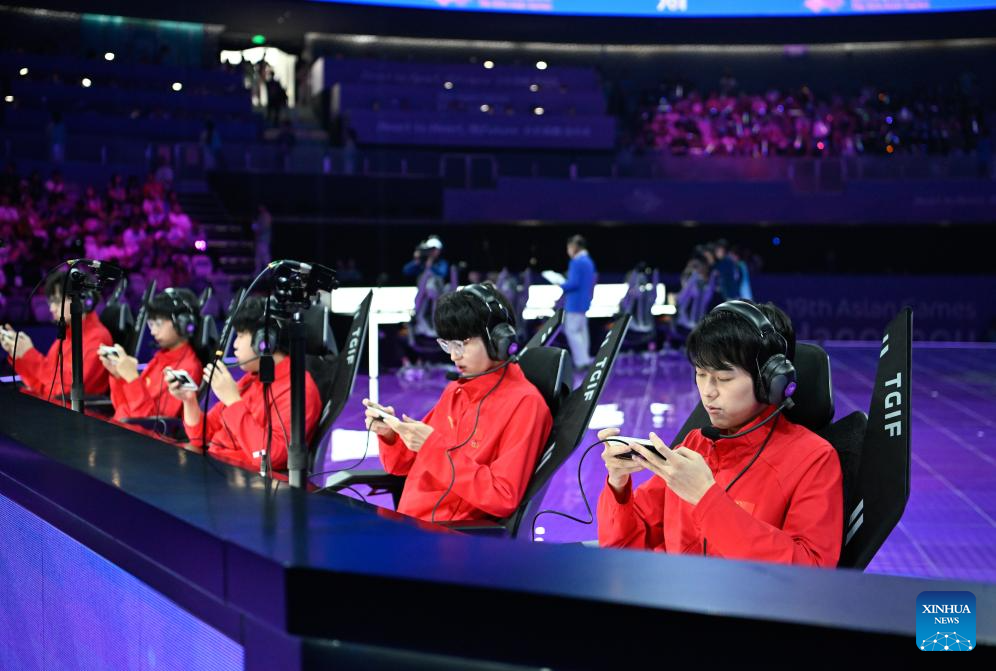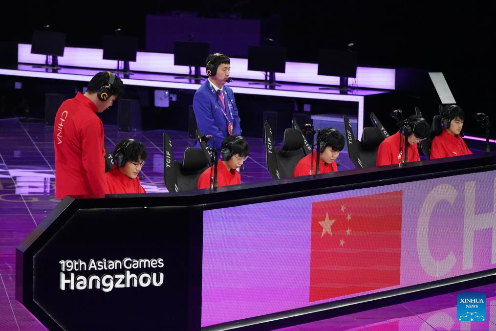 Players of team China compete during the Arena of Valor Asian Games Version Final match of Esports at the 19th Asian Games in Hangzhou, east China's Zhejiang Province, Sept. 26, 2023. (Xinhua/Han Chuanhao)