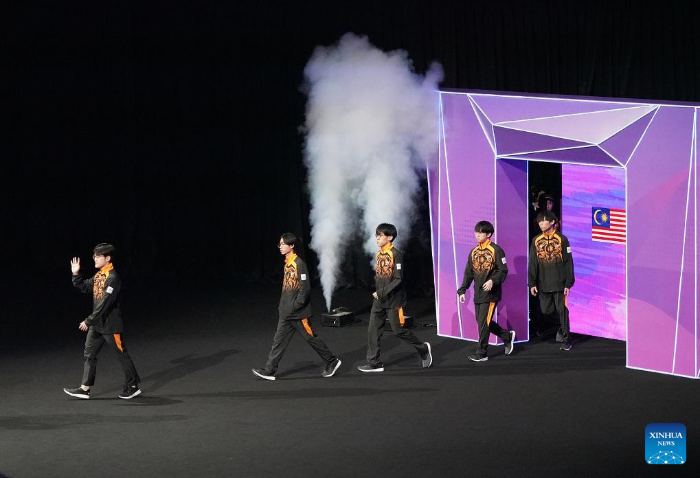 Players of team Malaysia enter into the venue before the Arena of Valor Asian Games Version Final match of Esports at the 19th Asian Games in Hangzhou, east China's Zhejiang Province, Sept. 26, 2023. (Xinhua/Han Chuanhao)