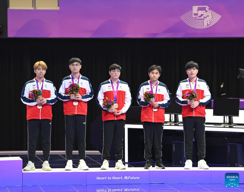 Bronze Medalists of team Thailand attend the awarding ceremony for the Arena of Valor Asian Games Version of Esports at the 19th Asian Games in Hangzhou, east China's Zhejiang Province, Sept. 26, 2023. (Xinhua/Yan Linyun)