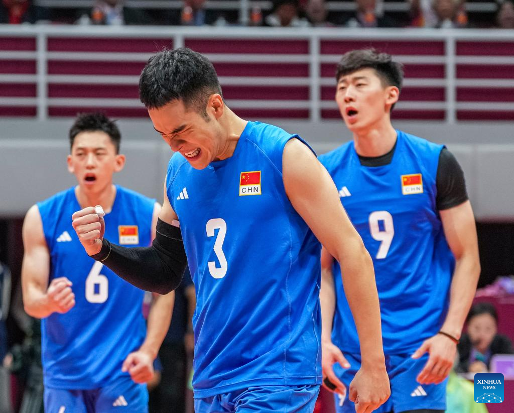 Jiang Chuan (C) of China reacts during the Volleyball Men's Gold Medal Match between China and Iran at the 19th Asian Games in Hangzhou, east China's Zhejiang Province, Sept. 26, 2023. (Xinhua/Sun Fei)