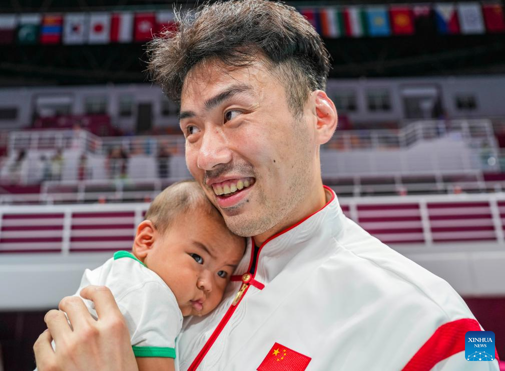 Dai Qingyao of China holds his son after the Volleyball Men's Gold Medal Match between China and Iran at the 19th Asian Games in Hangzhou, east China's Zhejiang Province, Sept. 26, 2023. (Xinhua/Sun Fei)