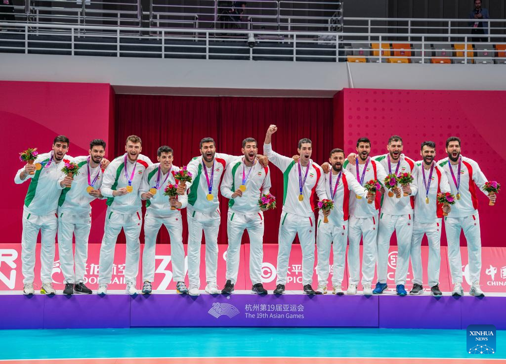 Gold Medalists of Team Iran attend the awarding ceremony for Men's Volleyball at the 19th Asian Games in Hangzhou, east China's Zhejiang Province, Sept. 26, 2023. (Xinhua/Sun Fei)