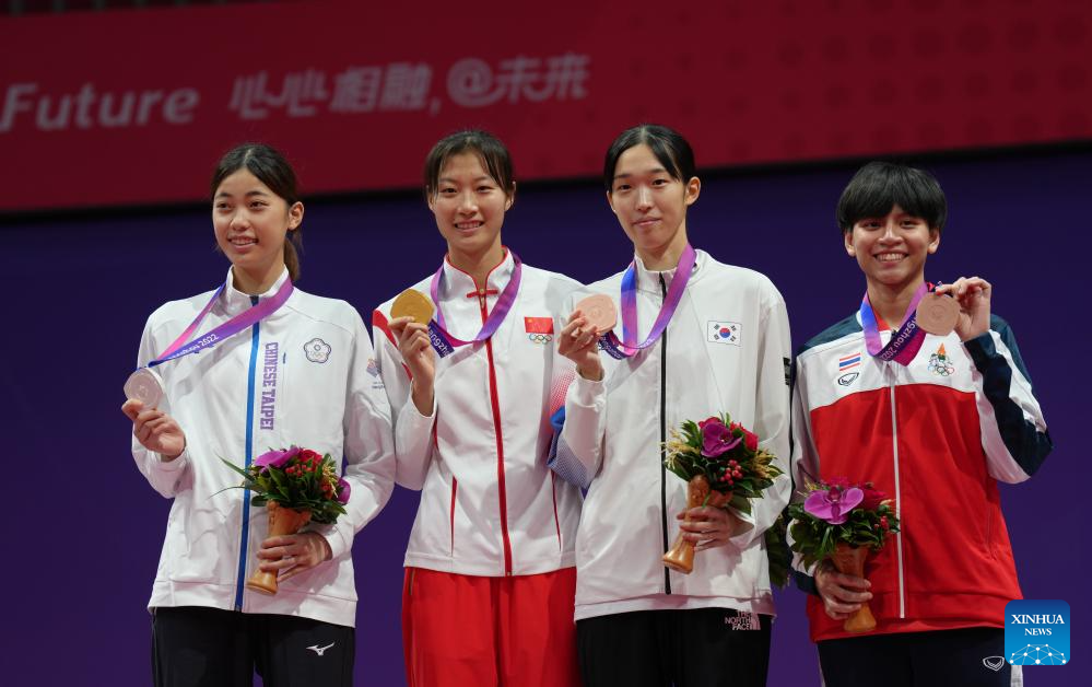 Luo Zongshi (2nd L) of China, Lo Chia Ling (1st L) of Chinese Taipei, Kim Yujin (3rd L) of South Korea and Harnsujin Phannapa of Thailand pose during the awarding ceremony of the Women's 57kg of Taekwondo at the 19th Asian Games in Hangzhou, east China's Zhejiang Province, Sept. 26, 2023. (Xinhua/Jiang Wenyao)