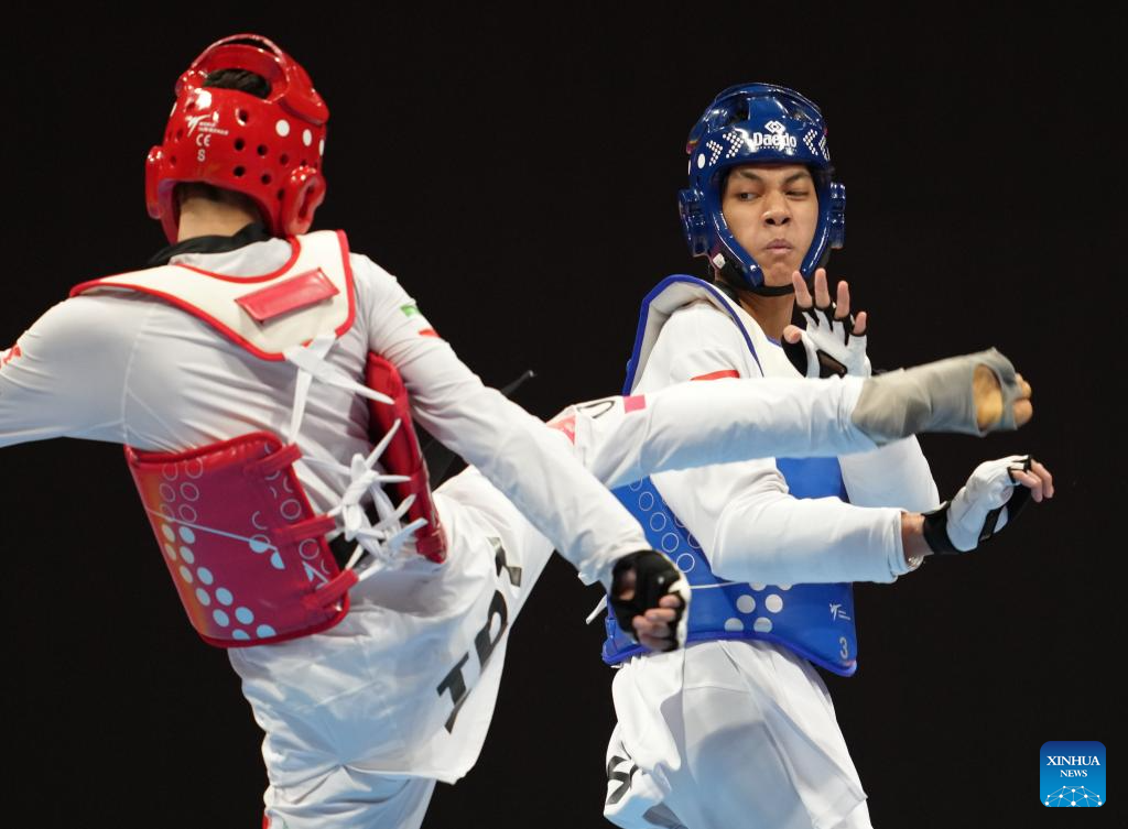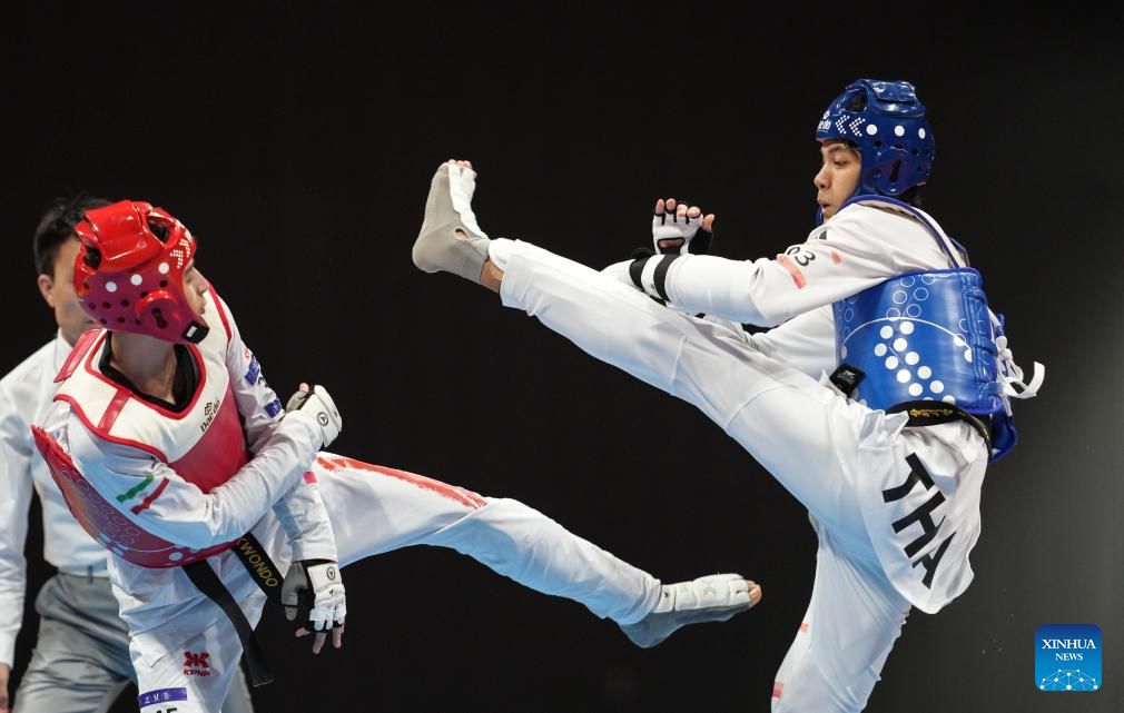Banlung Tubtimdang (R) of Thailand competes with Alireza Hosseinpour of Iran during the Taekwondo Men's 63kg Gold Medal Contest at the 19th Asian Games in Hangzhou, east China's Zhejiang Province, Sept. 26, 2023. (Xinhua/Jiang Wenyao)