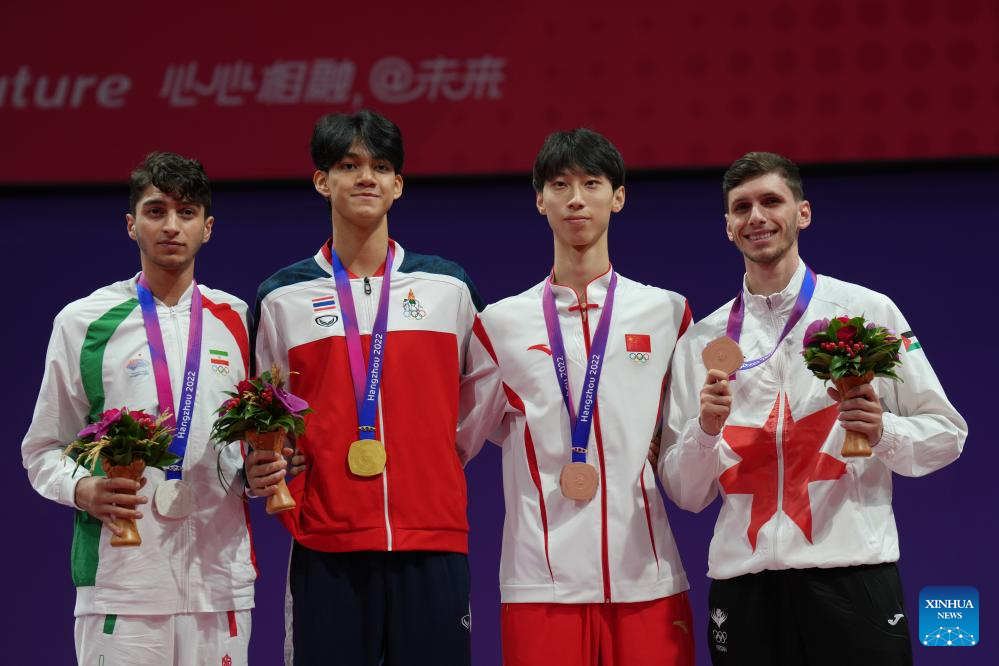 Medalists attend awarding ceremony of the Taekwondo Men's 63kg Contest at the 19th Asian Games in Hangzhou, east China's Zhejiang Province, Sept. 26, 2023. (Xinhua/Jiang Wenyao)