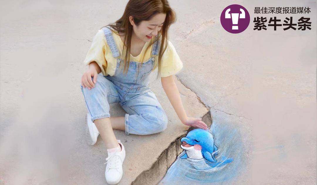 Tang Zixi, a 26-year-old Chinese artist, poses for a photo with a picture of a little dolphin swimming in the sea. She created the picture based on cracks on the ground to make the spot more pleasing to the eye. (Photo courtesy of Tang Zixi)