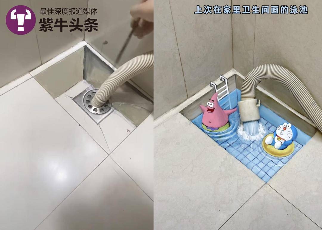 Photo shows a creation of Tang Zixi, a 26-year-old Chinese artist. The ugly floor tile around the floor drain in her bathroom has been turned into a picture of cartoon characters swimming in a sparkling pool. (Photo courtesy of Tang Zixi)