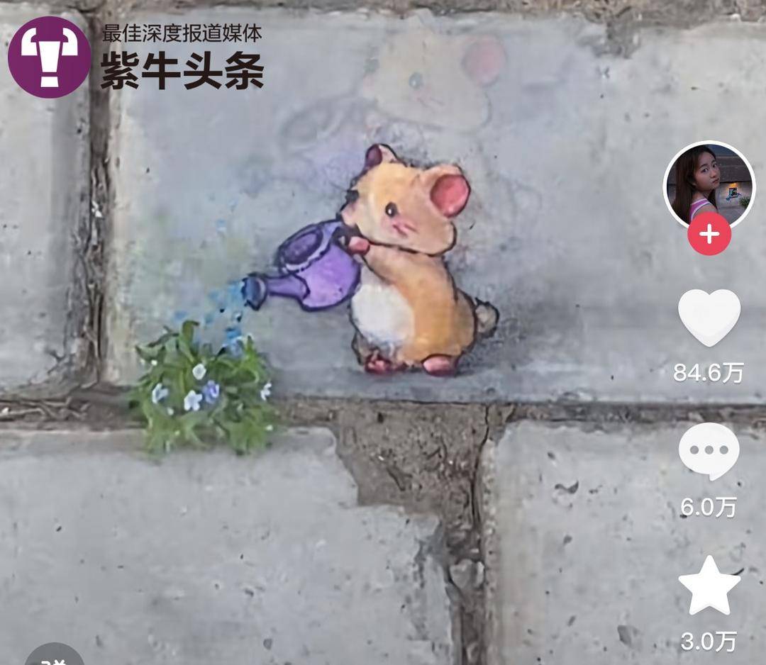 Photo shows a picture of a hamster holding a watering can painted by Tang Zixi, a 26-year-old Chinese artist, which adds vibrance to a cluster of purple flowers growing in a gap between floor bricks. (Photo courtesy of Tang Zixi)