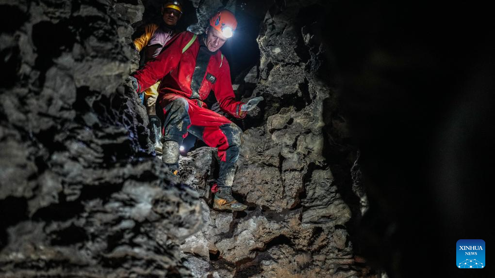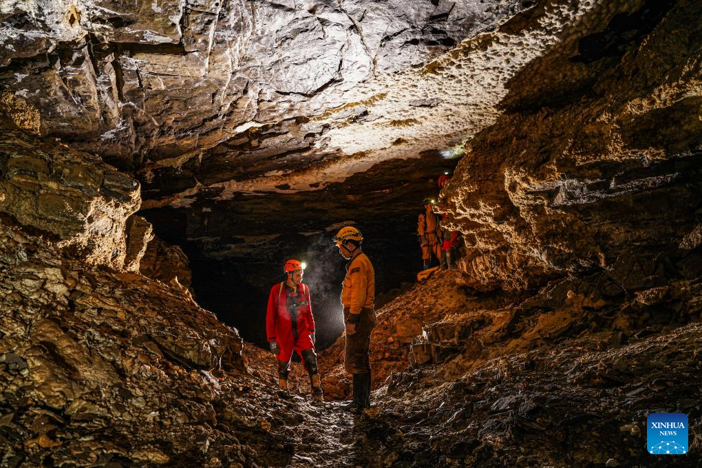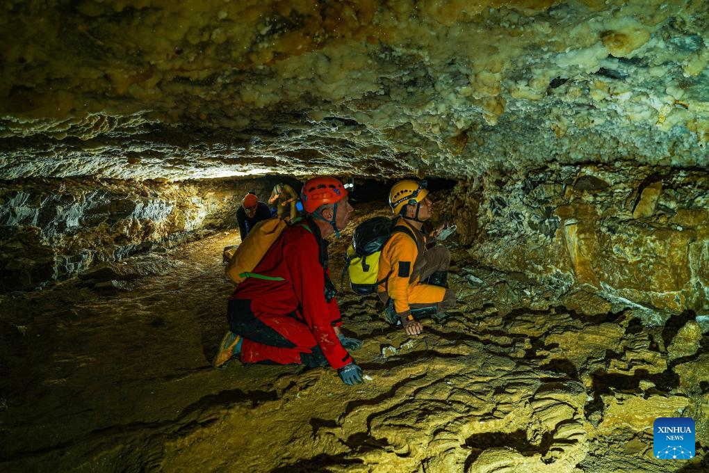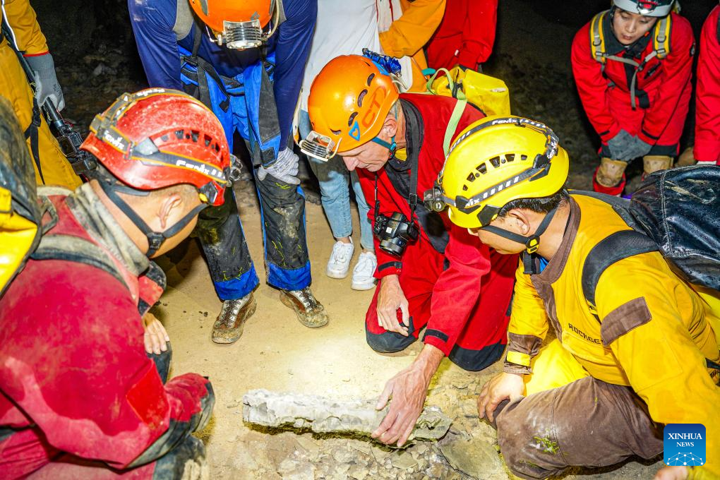 An Italian expert and members of Guizhou provincial mountain resources institute explore a branch cave of Shuanghe Cave in Suiyang County, southwest China's Guizhou Province, Sept. 24, 2023. (Xinhua/Tao Liang)