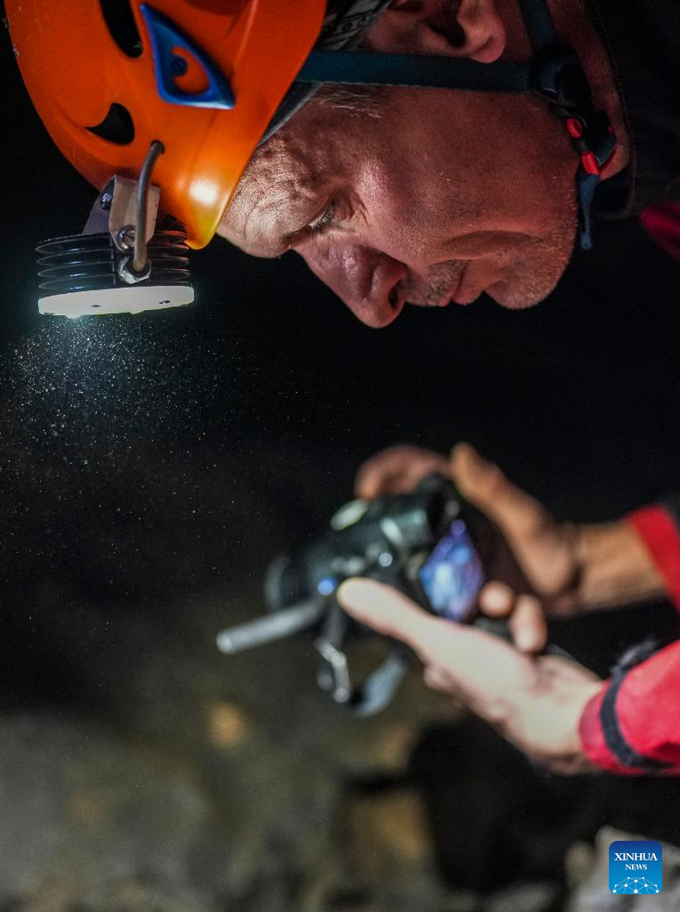 An Italian expert and members of Guizhou provincial mountain resources institute conduct an expedition inside a branch cave of Shuanghe Cave in Suiyang County, southwest China's Guizhou Province, Sept. 22, 2023. (Photo by Zhao Fei/Xinhua)