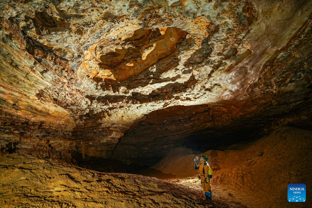 An Italian expert conducts an expedition inside a branch cave of Shuanghe Cave in Suiyang County, southwest China's Guizhou Province, Sept. 24, 2023. (Xinhua/Tao Liang)