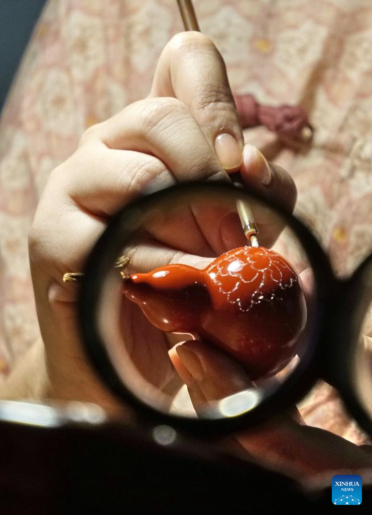 A piece of multi-color carved lacquer accessory made with new techniques is seen at Hai Yan's studio in the Cheng'en Temple in Beijing, capital of China, Sept. 21, 2023. (Xinhua/Li Xin)