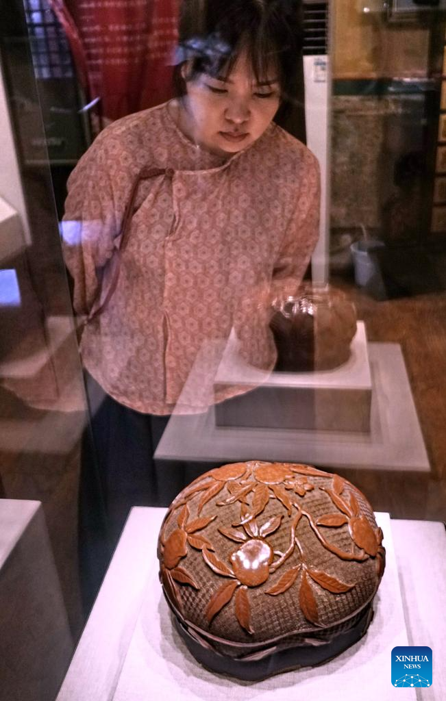 Hai Yan watches a piece of ancient carved lacquer artwork at the Beijing Eight Imperial Handicrafts Museum in the Cheng'en Temple in Beijing, capital of China, Sept. 8, 2023. (Xinhua/Li Xin)