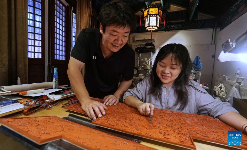 Hai Yan learns ancient patterns of carved lacquer artworks at the Beijing Eight Imperial Handicrafts Museum in the Cheng'en Temple in Beijing, capital of China, Sept. 19, 2023. (Xinhua/Li Xin)