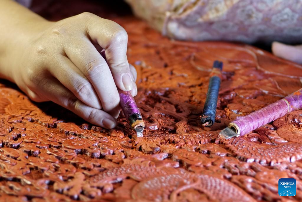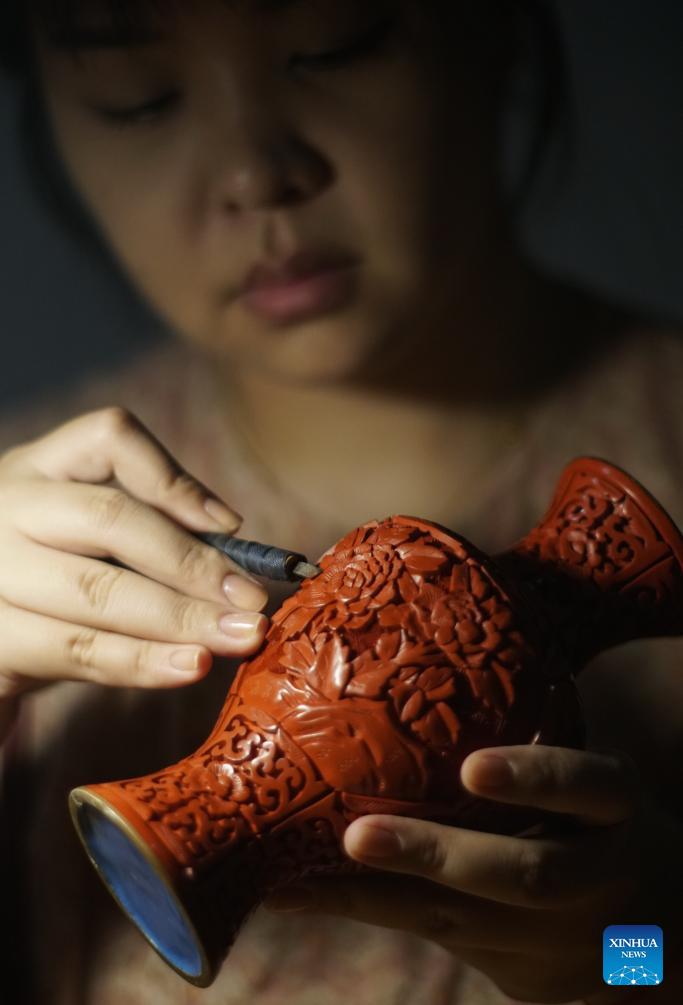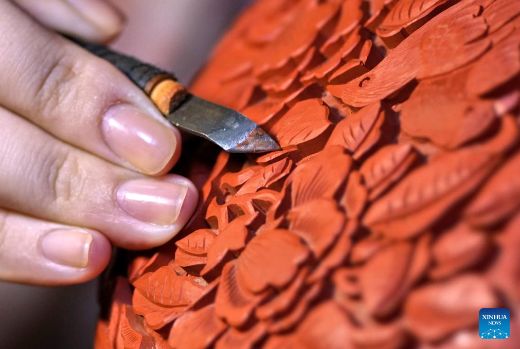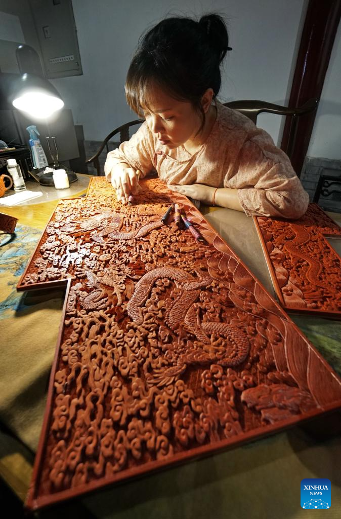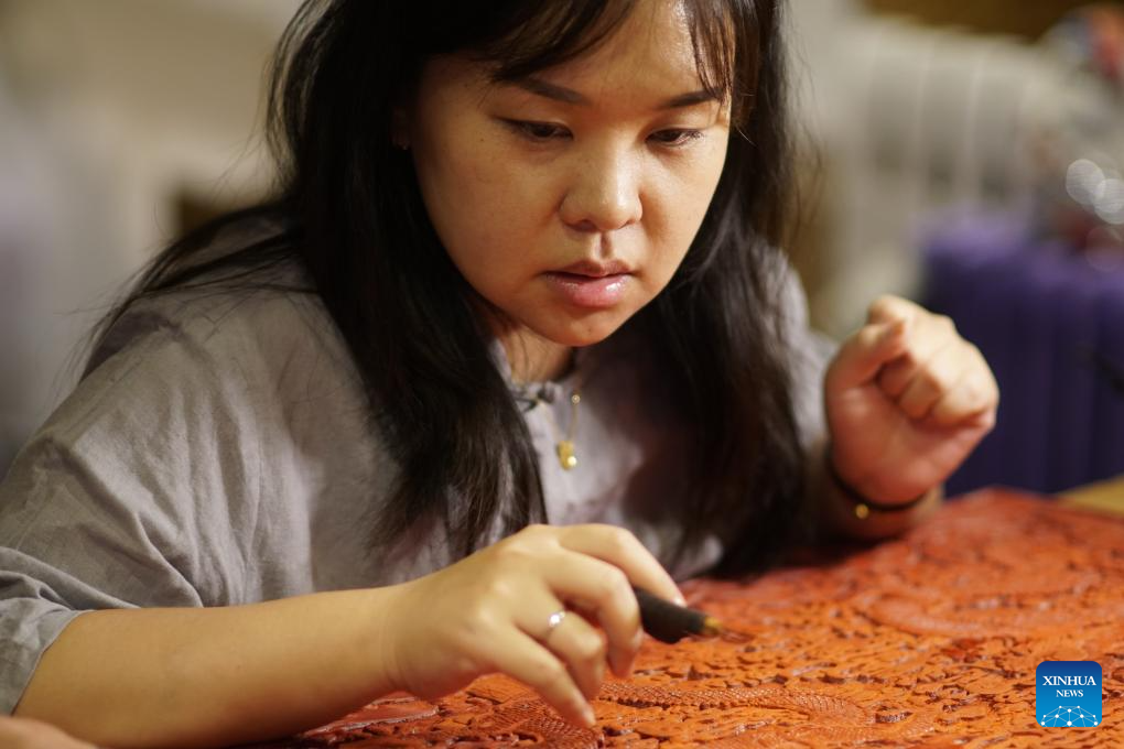 Hai Yan makes a carved lacquer artwork at her studio in the Cheng'en Temple in Beijing, capital of China, Sept. 8, 2023. (Xinhua/Li Xin)