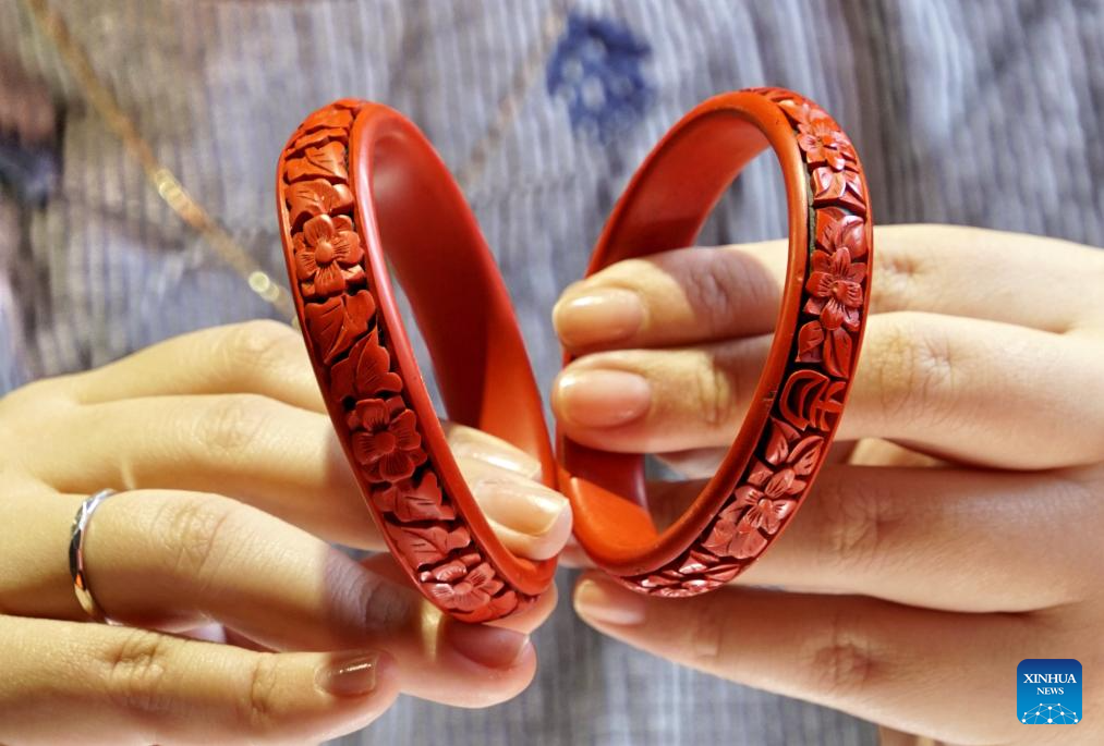 Hai Yan shows carved lacquer bracelets with traditional and modern patterns at her studio in the Cheng'en Temple in Beijing, capital of China, Sept. 21, 2023. (Xinhua/Li Xin)