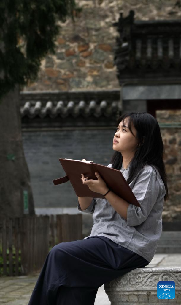 Hai Yan observes and draws patterns on ancient architectures at the Cheng'en Temple in Beijing, capital of China, Sept. 19, 2023. (Xinhua/Li Xin)