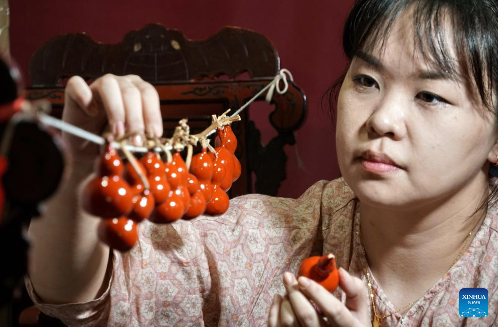 Hai Yan watches gourd-shaped wares before carving at her studio in the Cheng'en Temple in Beijing, capital of China, Sept. 8, 2023. (Xinhua/Li Xin)