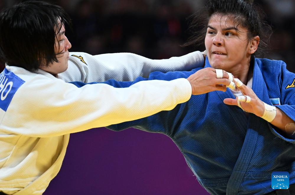 Japan's Tanaka Shiho (L) competes with Uzbekistan's Gulnoza Matniyazova during the Mixed Team Final of Judo at the 19th Asian Games in Hangzhou, east China's Zhejiang Province, Sept. 27, 2023. (Xinhua/Li An)