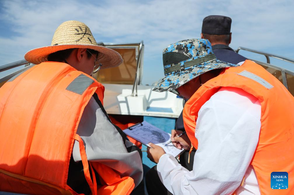 Team member Feng Chen measures the depth of water at an area of the Ulan Suhai Lake in Bayannur, north China's Inner Mongolia Autonomous Region, Sept. 15, 2023. (Xinhua/Wang Kaiyan)