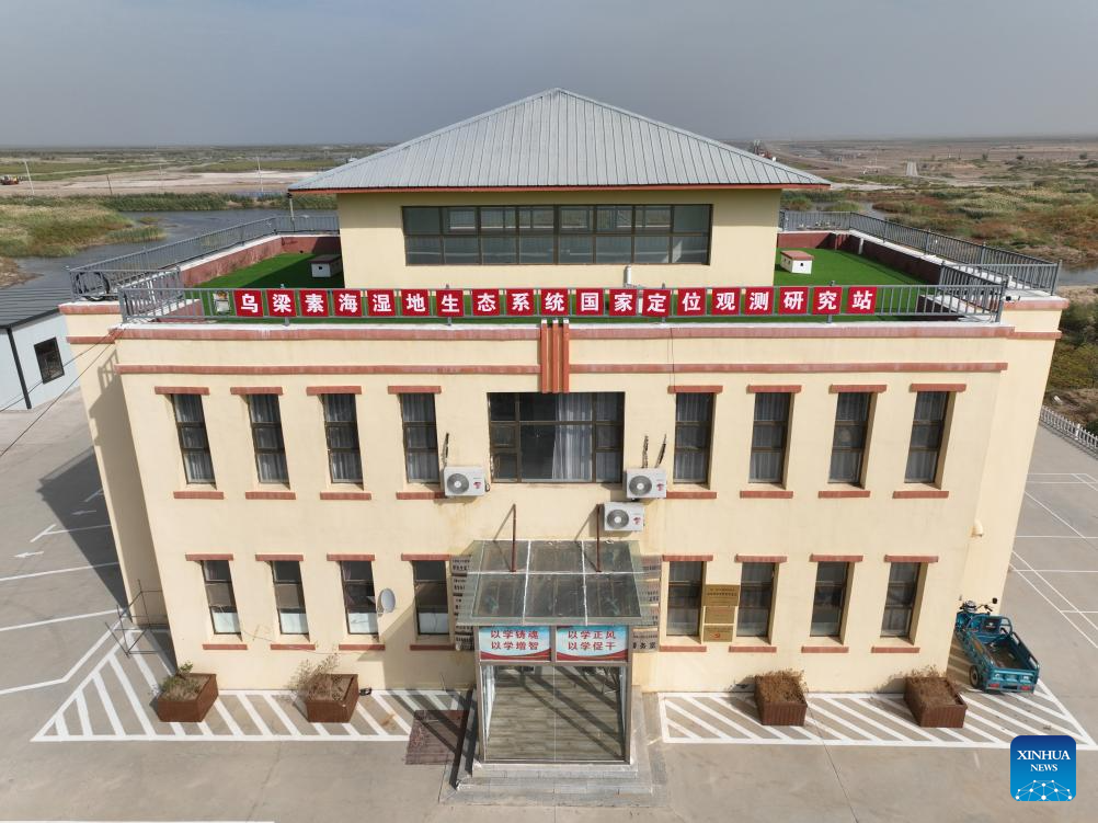 This aerial photo taken on Sept. 14, 2023 shows an observation station of the Ulan Suhai Lake in Bayannur, north China's Inner Mongolia Autonomous Region. (Xinhua/Xing Guangli)