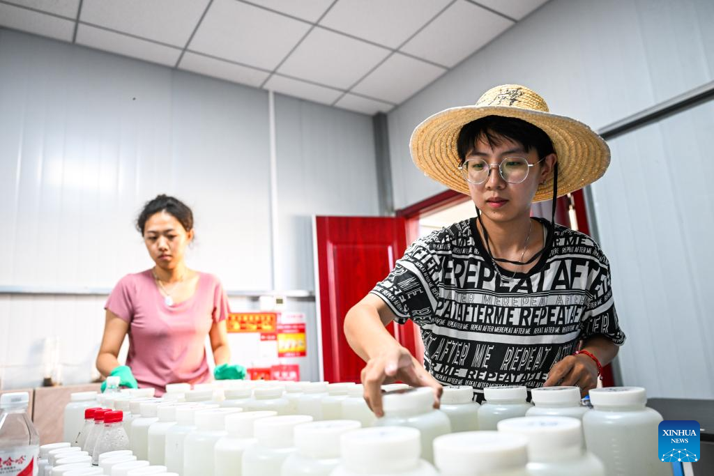 Wu Rong and her fellow students study water samples taken from the Ulan Suhai Lake at a laboratory in Bayannur, north China's Inner Mongolia Autonomous Region, Sept. 14, 2023. (Xinhua/Wang Kaiyan)