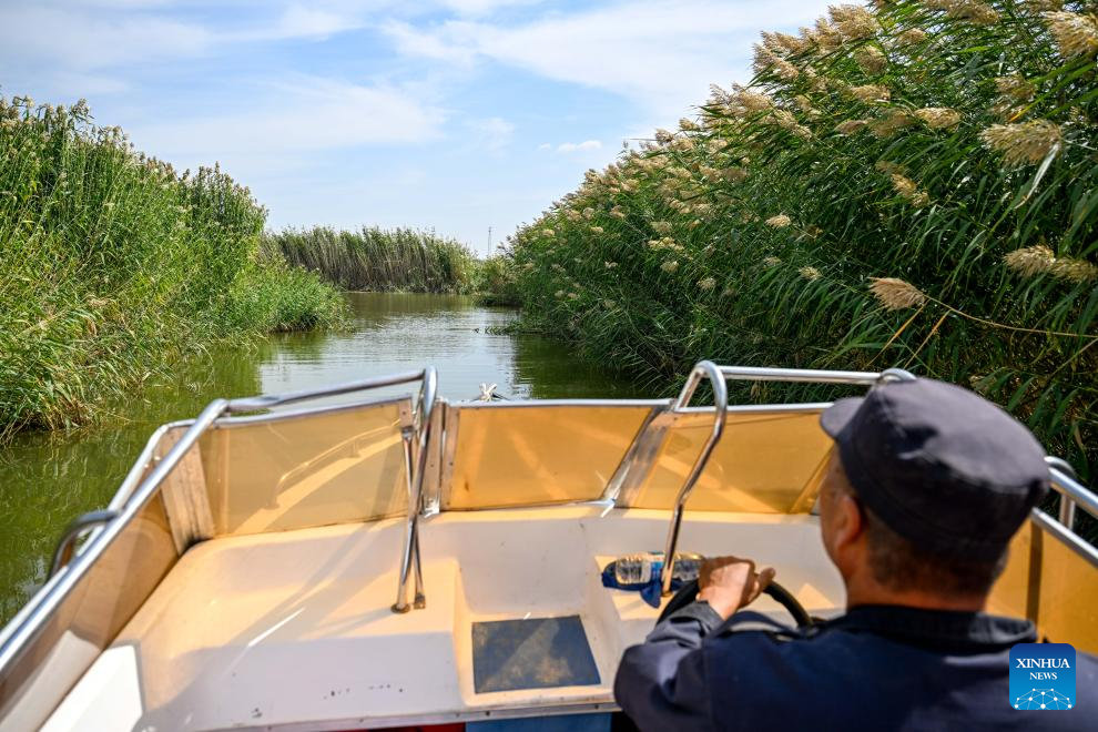 Wu Rong checks the water quality of the Ulan Suhai Lake in Bayannur, north China's Inner Mongolia Autonomous Region, Sept. 15, 2023. (Xinhua/Lian Zhen)