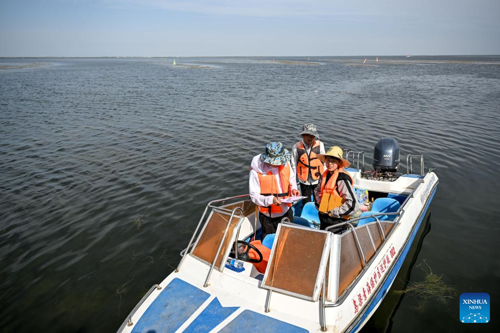 Team members take a yacht to collect water samples from the Ulan Suhai Lake in Bayannur, north China's Inner Mongolia Autonomous Region, Sept. 15, 2023. (Xinhua/Lian Zhen)