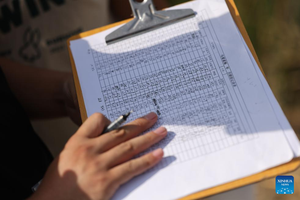 Wu Rong checks the record of water quality of the Ulan Suhai Lake in Bayannur, north China's Inner Mongolia Autonomous Region, Sept. 14, 2023. (Xinhua/Xing Guangli)