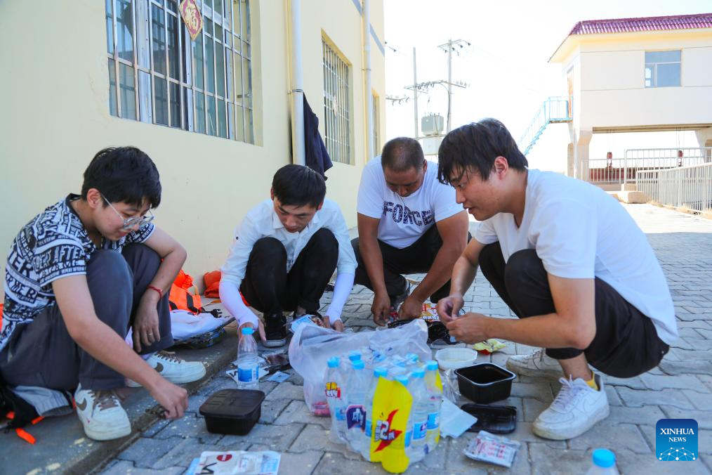Team members have lunch after collecting water samples from the Ulan Suhai Lake in Bayannur, north China's Inner Mongolia Autonomous Region, Sept. 15, 2023. (Xinhua/Wang Kaiyan)