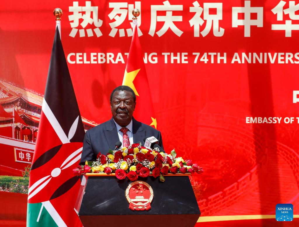 Kenya's Prime Cabinet Secretary Musalia Mudavadi addresses a reception to mark the upcoming 74th anniversary of the founding of the People's Republic of China in Nairobi, Kenya, on Sept. 27, 2023. The Chinese Embassy in Kenya hosted the reception on Wednesday to mark the upcoming 74th anniversary of the founding of the People's Republic of China (PRC). (Xinhua/Li Yahui)
