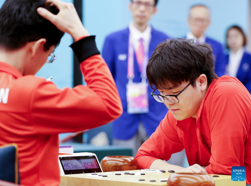 Hsu Haohung (L) of Chinese Taipei competes against Shin Jinseo of South Korea during the Men's Individual Semifinal of Go Chess at the 19th Asian Games in Hangzhou, east China's Zhejiang Province, Sept. 28, 2023. (Xinhua/Gong Bing)