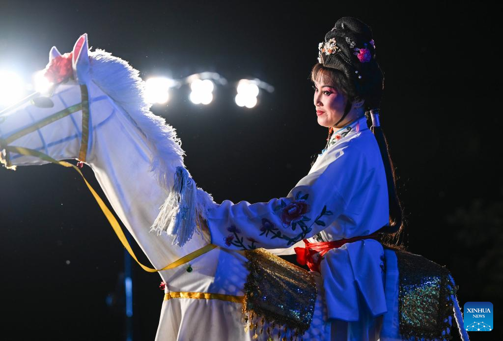 A show is staged during an artistic performance promoting Chinese culture at the Asian Games Sub-village in Chun'an, east China's Zhejiang Province, Sept. 25, 2023. (Xinhua/Hu Huhu)