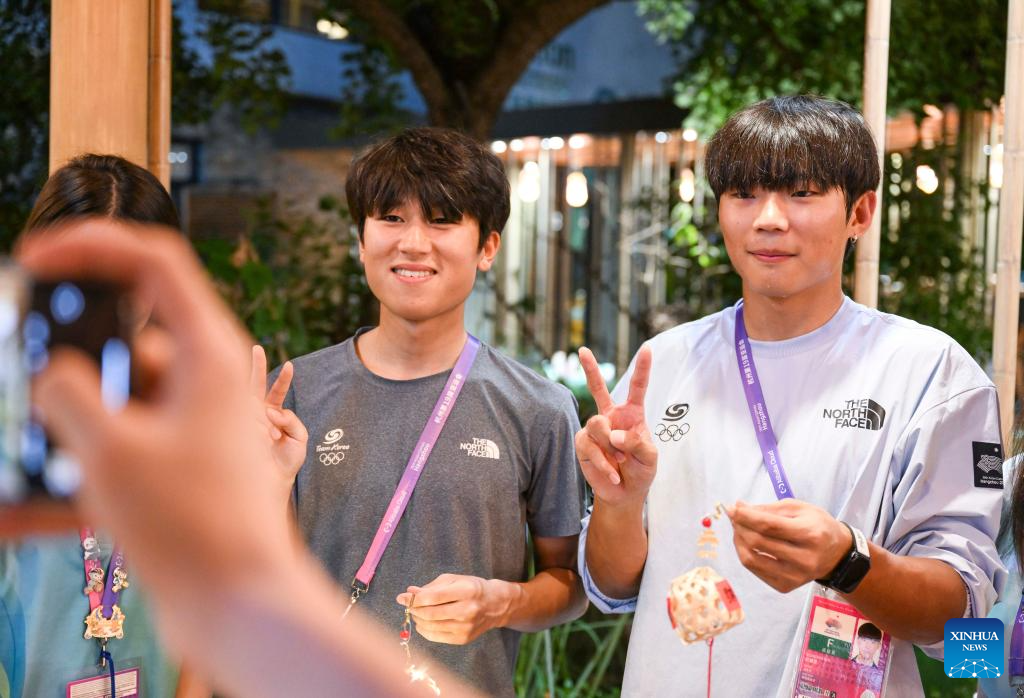 Members of Team South Korea pose for photos after experiencing traditional Chinese handicraft at the Asian Games Sub-village in Chun'an, east China's Zhejiang Province, Sept. 25, 2023. (Xinhua/Hu Huhu)