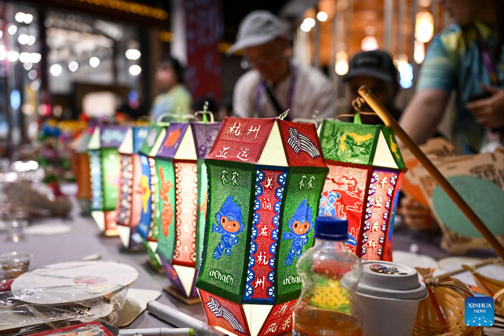 Members of different delegations experience traditional Chinese handicraft at the Asian Games Sub-village in Chun'an, east China's Zhejiang Province, Sept. 25, 2023. (Xinhua/Hu Huhu)