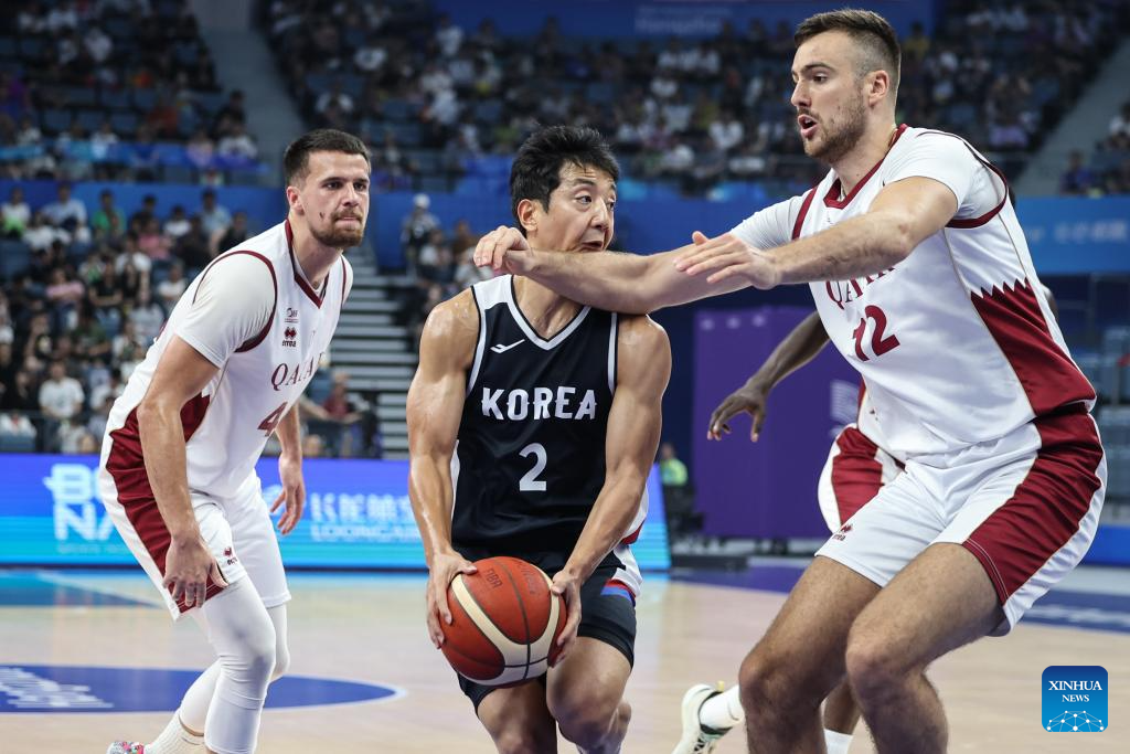 Heo Hoon (C) of South Korea breaks through during the Men's Preliminary Round Group D match of Basketball between South Korea and Qatar at the 19th Asian Games in Hangzhou, east China's Zhejiang Province, Sept. 28, 2023. (Xinhua/Pan Yulong)
