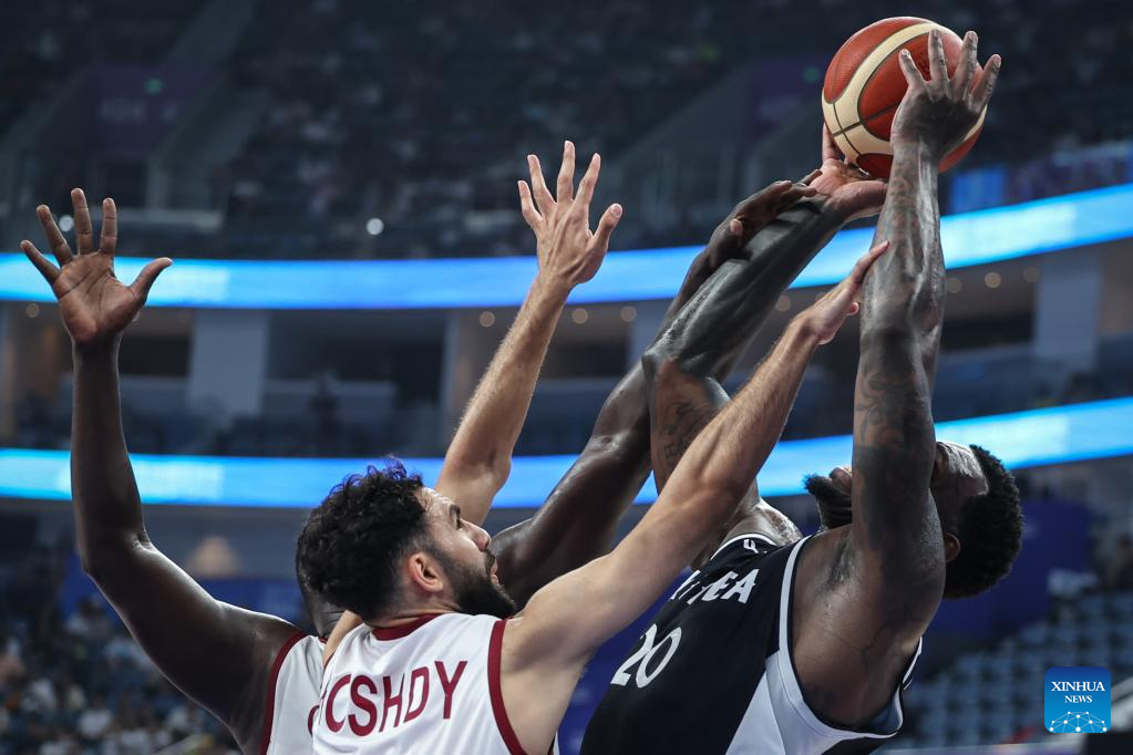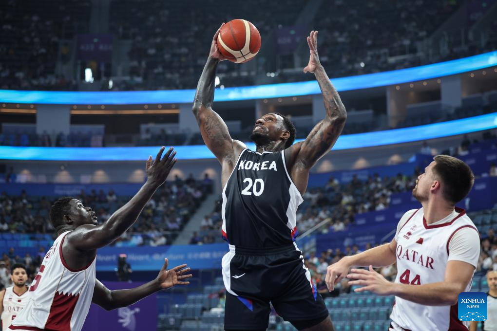 Guna RA (C) of South Korea grabs rebound during the Men's Preliminary Round Group D match of Basketball between South Korea and Qatar at the 19th Asian Games in Hangzhou, east China's Zhejiang Province, Sept. 28, 2023. (Xinhua/Pan Yulong)