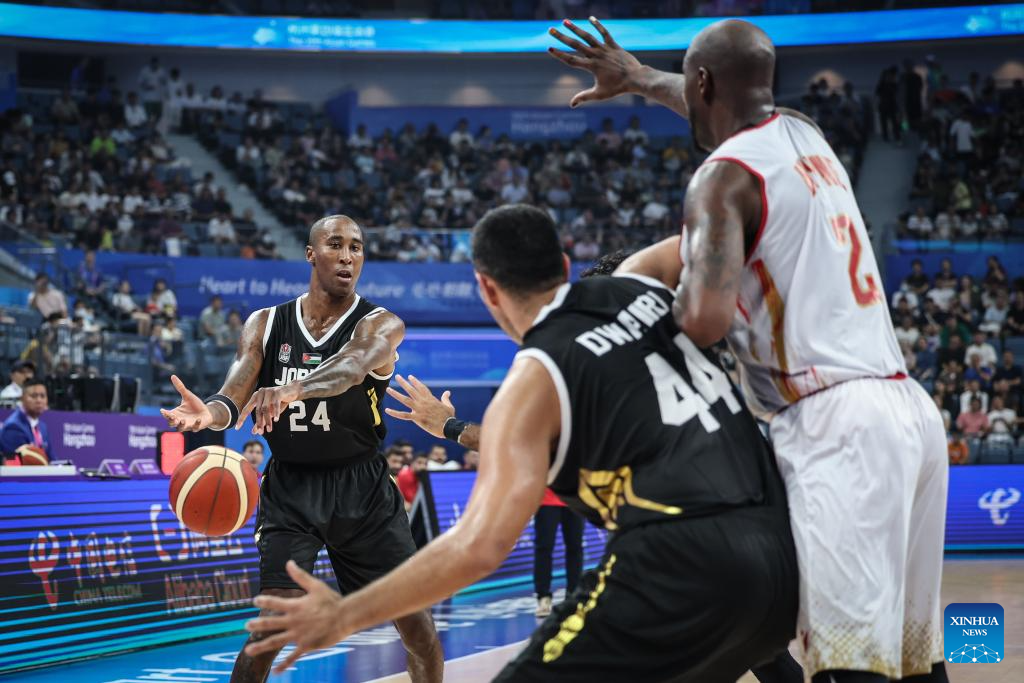Rondae Jefferson (L) of Jordan passes the ball during the Men's Preliminary Round Group C match of Basketball between Jordan and Bahrain at the 19th Asian Games in Hangzhou, east China's Zhejiang Province, Sept. 28, 2023. (Xinhua/Pan Yulong)