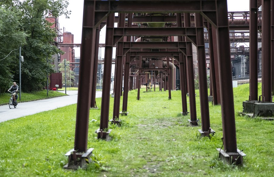 A man rides bicycle in the Zollverein coal mine industrial complex in Essen, Germany, Aug. 16, 2023. (Xinhua/Zhang Fan)