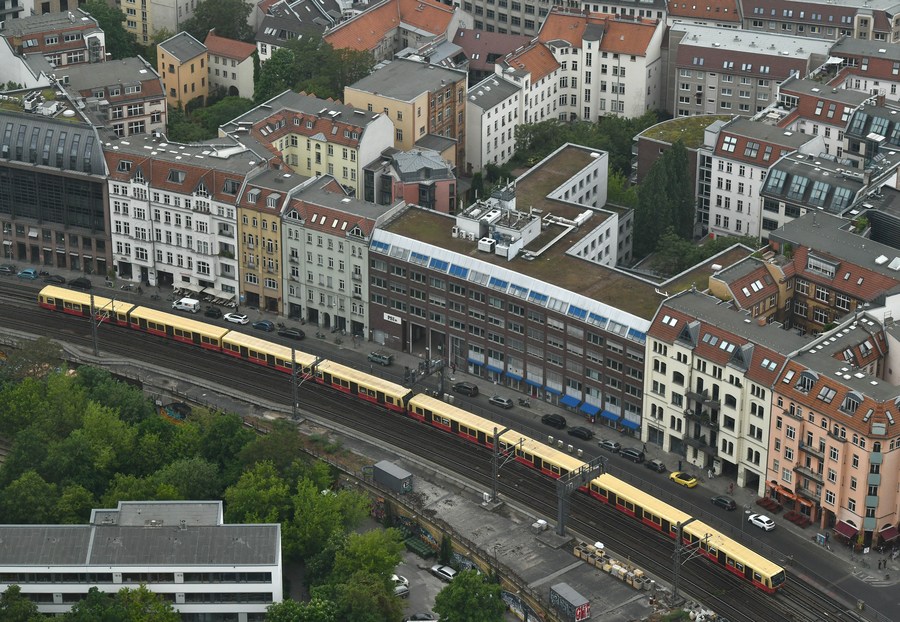 A train runs in downtown Berlin, Germany, May 23, 2023. (Xinhua/Ren Pengfei)