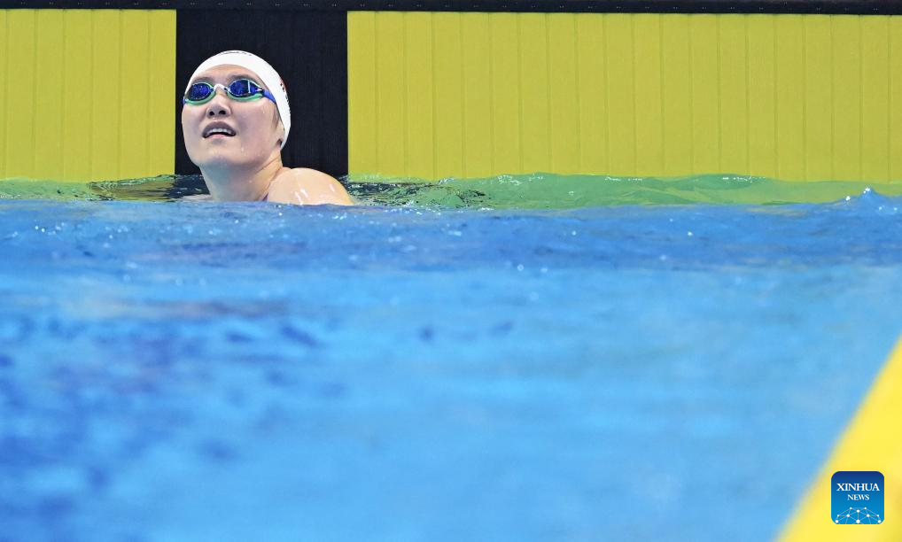 Ye Shiwen of China reacts after the Women's 200m Breaststroke Final of Swimming at the 19th Asian Games in Hangzhou, east China's Zhejiang Province, Sept. 28, 2023. (Xinhua/Xue Yuge)