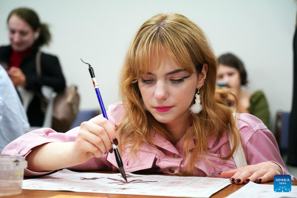 A person practices Chinese calligraphy during an event celebrating the Mid-Autumn Festival held by the Confucius Institute at the University of Latvia in Riga, Latvia, Sept. 25, 2023. Various celebrations are held across the world with the approaching of Mid-Autumn Festival. (Photo by Janis/Xinhua)