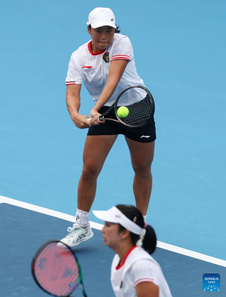 Aldila Sutjiadi/Janice Tjen of Indonesia compete during the Women's Doubles Semifinal Match of Tennis between Chinese Taipei and Indonesia at the 19th Asian Games in Hangzhou, east China's Zhejiang Province, Sept. 28, 2023. (Xinhua/Meng Chenguang)