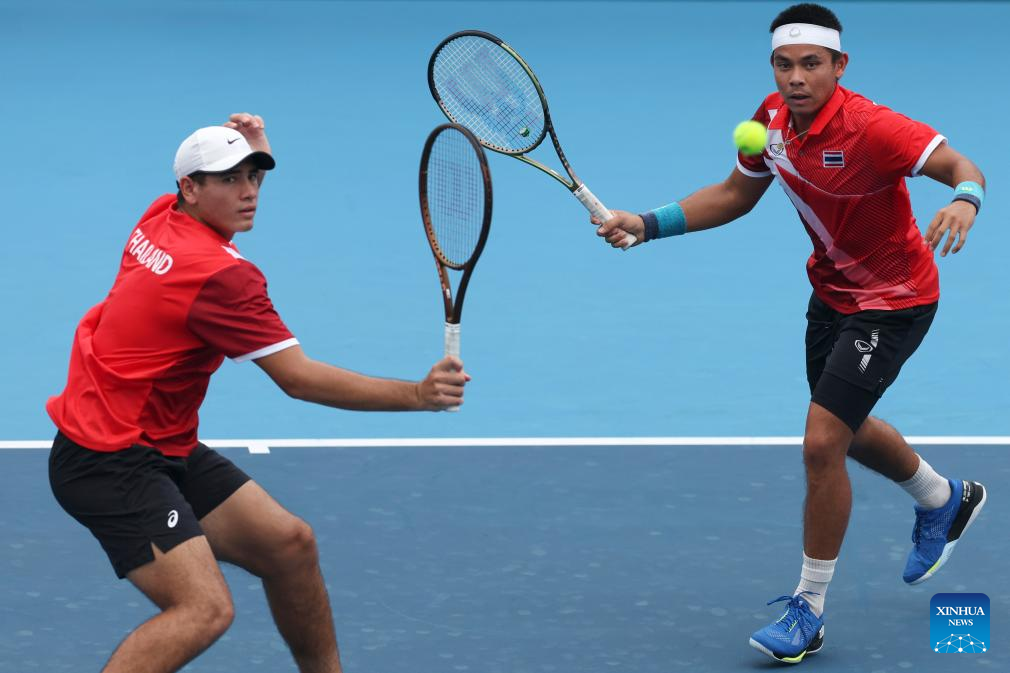 Pruchya Isaro/Maximus Parapol Jones of Thailand compete during the Men's Doubles Semifinal Match of Tennis between Pruchya Isaro/Maximus Parapol Jones of Thailand and Jung Jason/Hsu Yu-hsiou of Chinese Taipei at the 19th Asian Games in Hangzhou, east China's Zhejiang Province, Sept. 28, 2023. (Xinhua/Meng Chenguang)