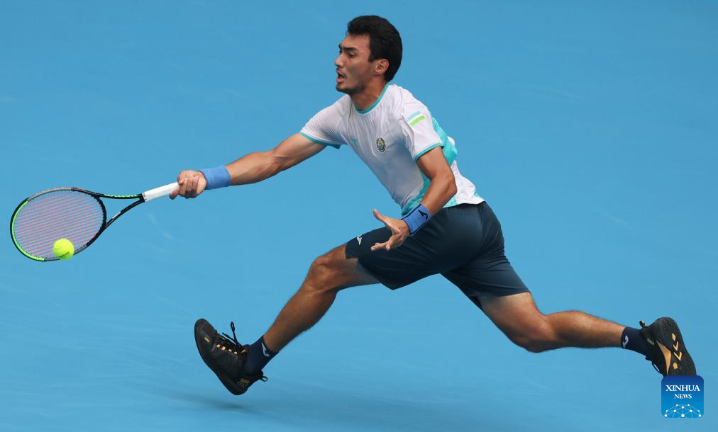 Khumoyun Sultanov of Uzbekistan competes during the Men's Singles Semifinal match of Tennis between Zhang Zhizhen of China and Khumoyun Sultanov of Uzbekistan at the 19th Asian Games in Hangzhou, east China's Zhejiang Province, Sept. 28, 2023. (Xinhua/Meng Chenguang)